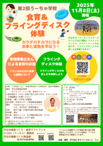 日時 11月8日(土) 午前9時30分~10時45分 ※終了後はニュースポーツひろばにもご参加いただけます(自由参加) 場所 黄檗体育館 対象者 市内在住 4歳~小学生と保護者 内容 バランスのとれた食事と運動について学び、心身ともに健康に。フライングディスク体験も! 協力団体 宇治市スポーツ推進委員協議会・Chouette Lien(シュエットリアン) 定員 親子15組(申込多数の場合抽選となります) 参加費 無料