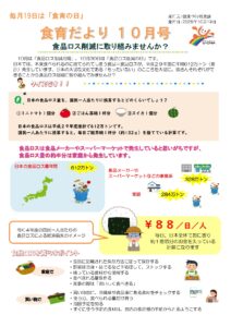 今月の食育だよりのテーマは“ロス削減に取り組みませんか?”です。 10月は「食品ロス削減月間」、10月30日は「食品ロス削減の日」です。 日本では、本来食べられるのに捨てられてしまう食品=食品ロスが、平成29年度に年間612万トン(推計)発生しています。日本の大切な文化である「もったいない」のこころを大切に、皆さんそれぞれができることから食品ロス削減に取り組んでみませんか? ぜひご覧ください。