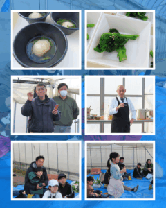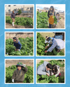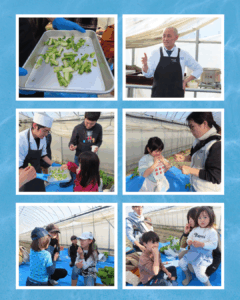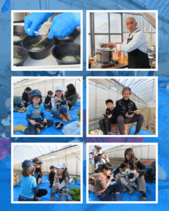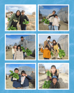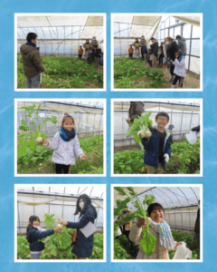 ご参加くださった子どもたち、皆さん、ありがとうございました! うーちゃ学校「宇治の青空レストラン」 日時:1月25日(日) 午後2時~4時 京野菜いのうちさんの農園で、「小かぶ」と「菜の花(ハナナ)」の収穫体験。その後、収穫したお野菜を京料理辰巳屋さんに調理いただき、試食しました。 講師の井内さんと左さんの熱い想いを聞いたり、質問に答えていただいたり、親子それぞれが「食育や健康」について考える日になったのではと思います。