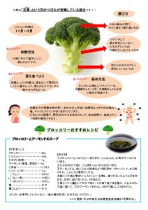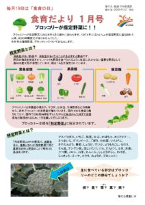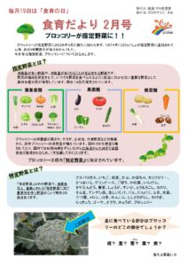 今月の食育だよりのテーマは“ブロッコリーが指定野菜に!”です。 ブロッコリーが指定野菜に2026年4月に新たに加わります。1974年にばれいしょが指定野菜に追加されて以来、約50年間変化がありませんでした。 今月号は指定野菜、ブロッコリーについてお伝えします。