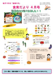 毎月19日は「食育の日」です。 健康づくり推進課より『食育だより』をお届けします。 今月の食育だよりのテーマは“「野菜のコツ集」できました!”です。 「野菜のコツ集」は宇治に住んでおられる方に日頃の野菜についての悩みを募集し、野菜や食育に詳しい専門家が、そんな日々の疑問や悩みにやさしくお答えし、野菜生活へのステップアップのお手伝いができる内容の冊子になっています。旬の野菜や、子どもが野菜に親しめる絵本の紹介、おいしく楽しく野菜を食べる方法、野菜の使い切りレシピなどすぐに実践できるヒントをたっぷり掲載しました。 PDFはこちらからご覧いただけます。
